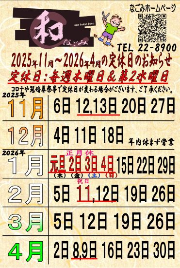 ☃️12月の定休日☃️ 4日(木曜日) 11日(木曜日) 18日(木曜日) 年内休まず営業 🎍1月の定休日🎍 1日(木曜日)正月休 2日(金曜日)正月休 3日(土曜日)正月休 4日(日曜日)正月休 15日( …